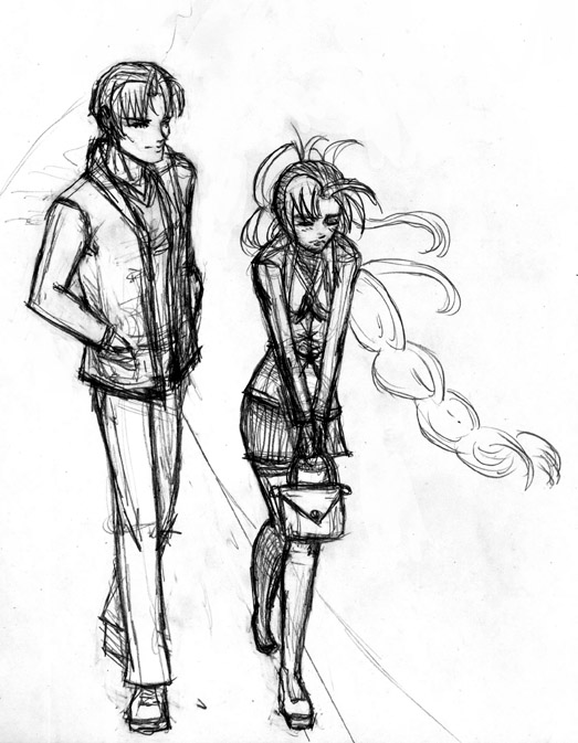 Left: Whenever I draw Aeka and Sam together she looks like she’s in physical pain just having to be near him. Sorry? Above: my favorite Sam sketch, done in class. That was tuition well spent….
