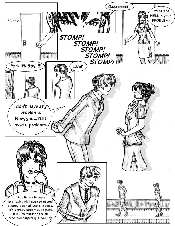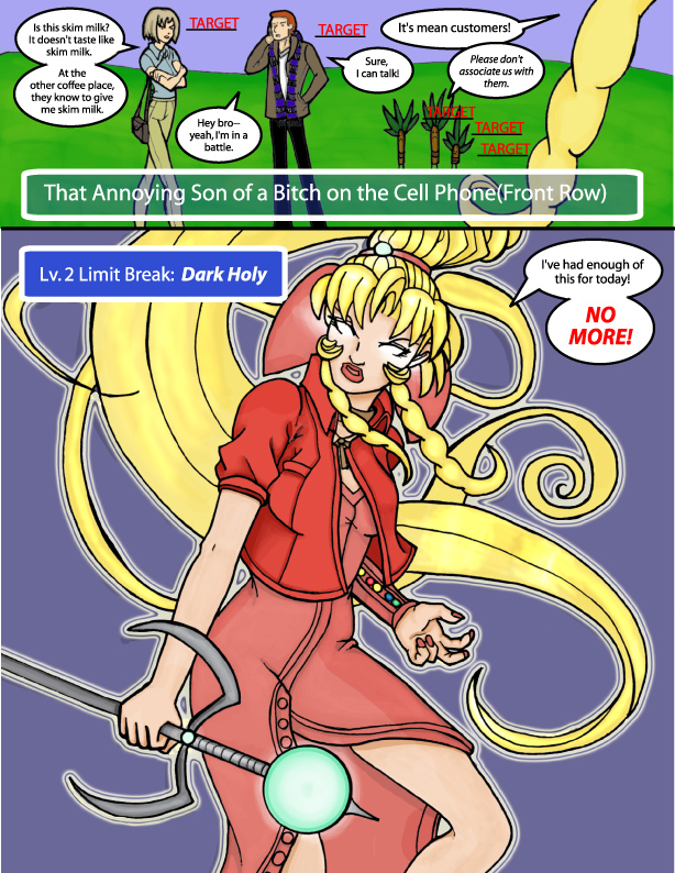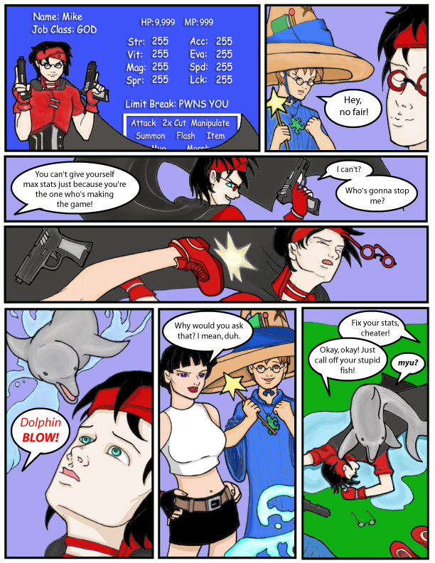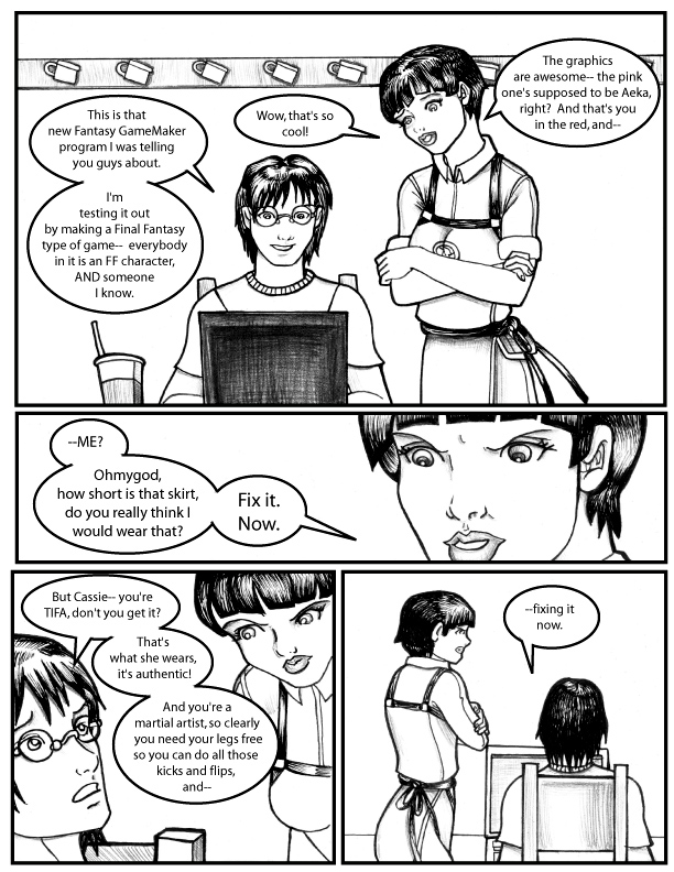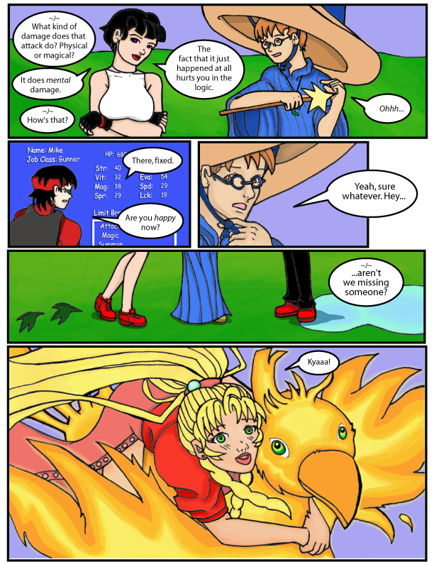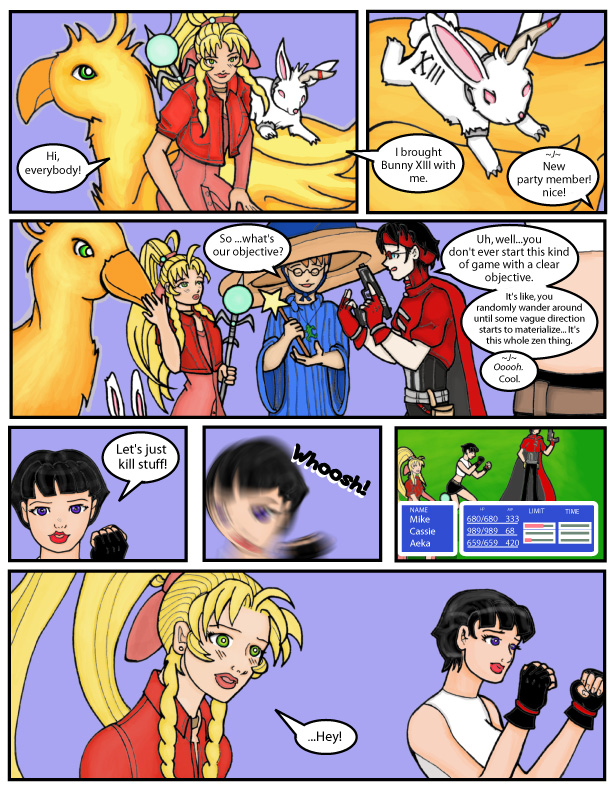 I did a sequence in the comic where my characters went inside the world of Final Fantasy VII. This is the only time (so far) that I’ve attempted full-color comics. The colors are really saturated– probably too much so– but I was trying to emulate the look of the game.